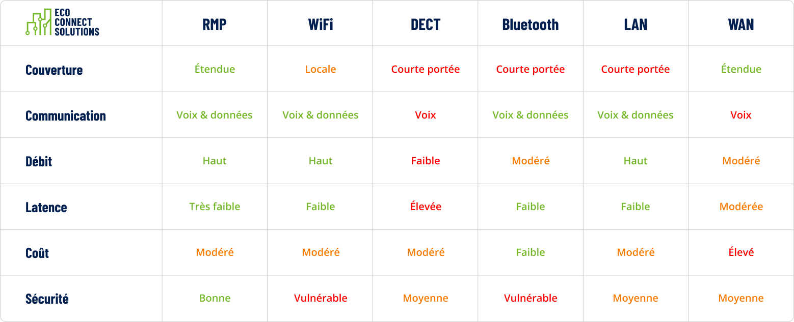 Les réseaux (cellulaires), qu’ils soient basés sur le WiFi ou la technologie RMP (Réseau mobile privé), offrent aux entreprises une connectivité flexible et sécurisée. Le WiFi garantit une couverture étendue et rapide pour les environnements de bureau, tandis que le RMP assure une communication fiable et robuste, particulièrement adapté aux secteurs nécessitant une grande résilience, comme l’industrie ou la logistique.